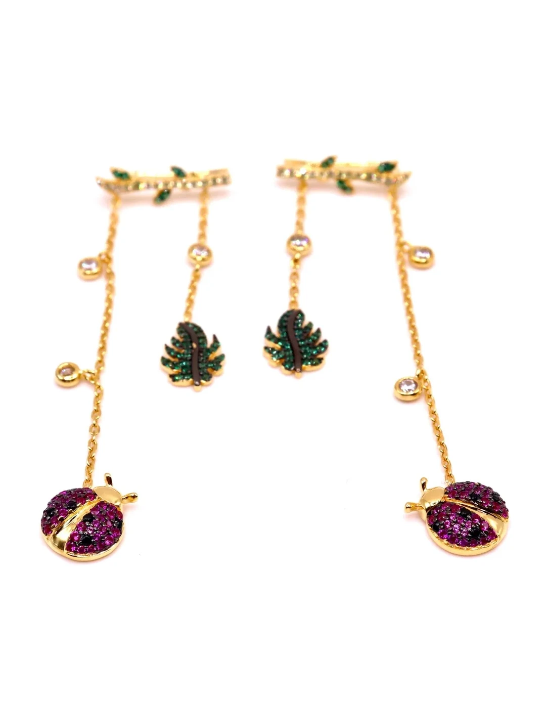 The long drop earrings represent perfectly the balance of Nature: ladybugs and leaves swinging on each side of branches.