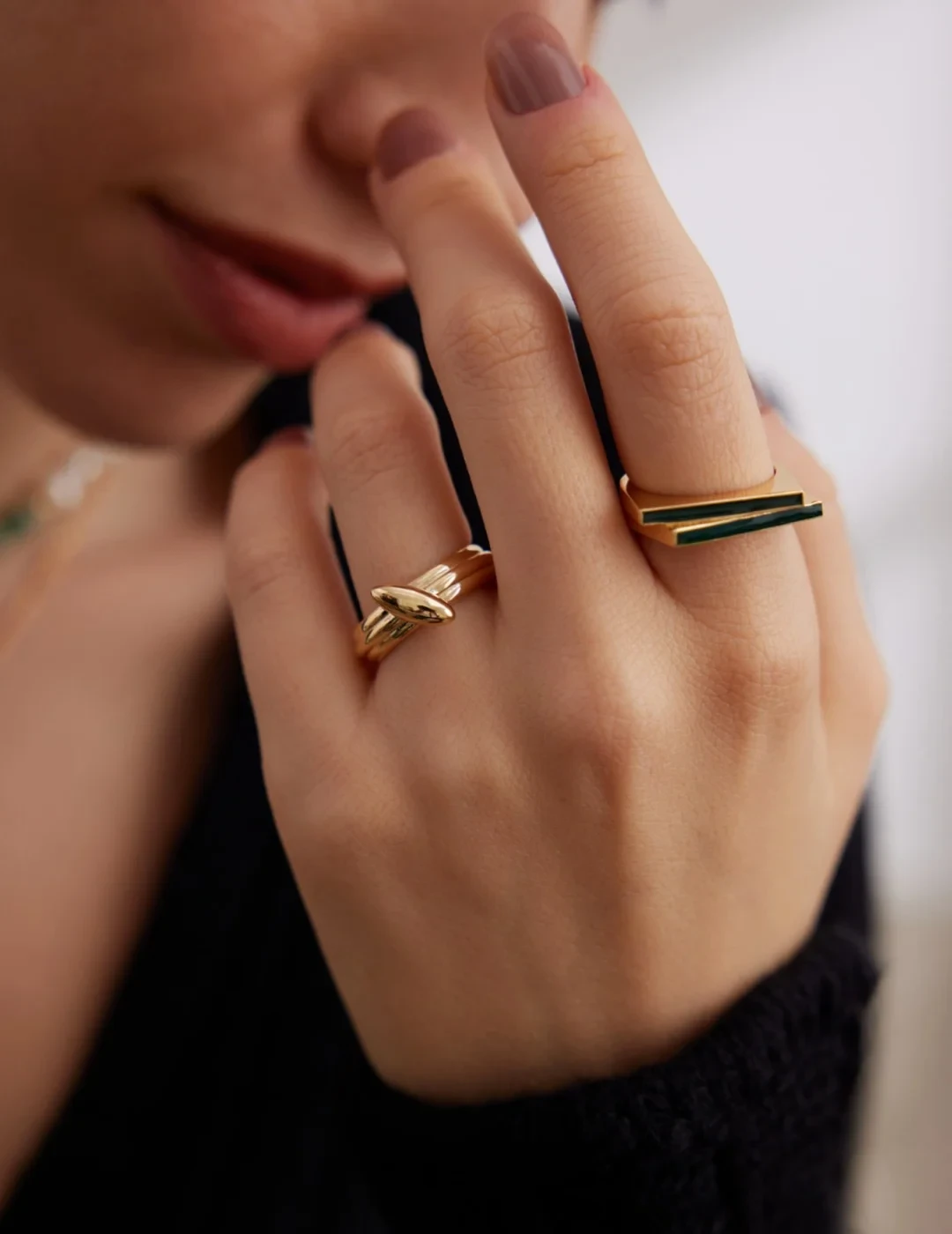 A minimalist masterpiece, this open-ended ring features two intersecting bands, one gleaming in polished gold, the other cloaked in a sleek black enamel. Their elegant interplay creates a bold yet understated statement, perfect for those who appreciate modern design with a touch of sophistication.