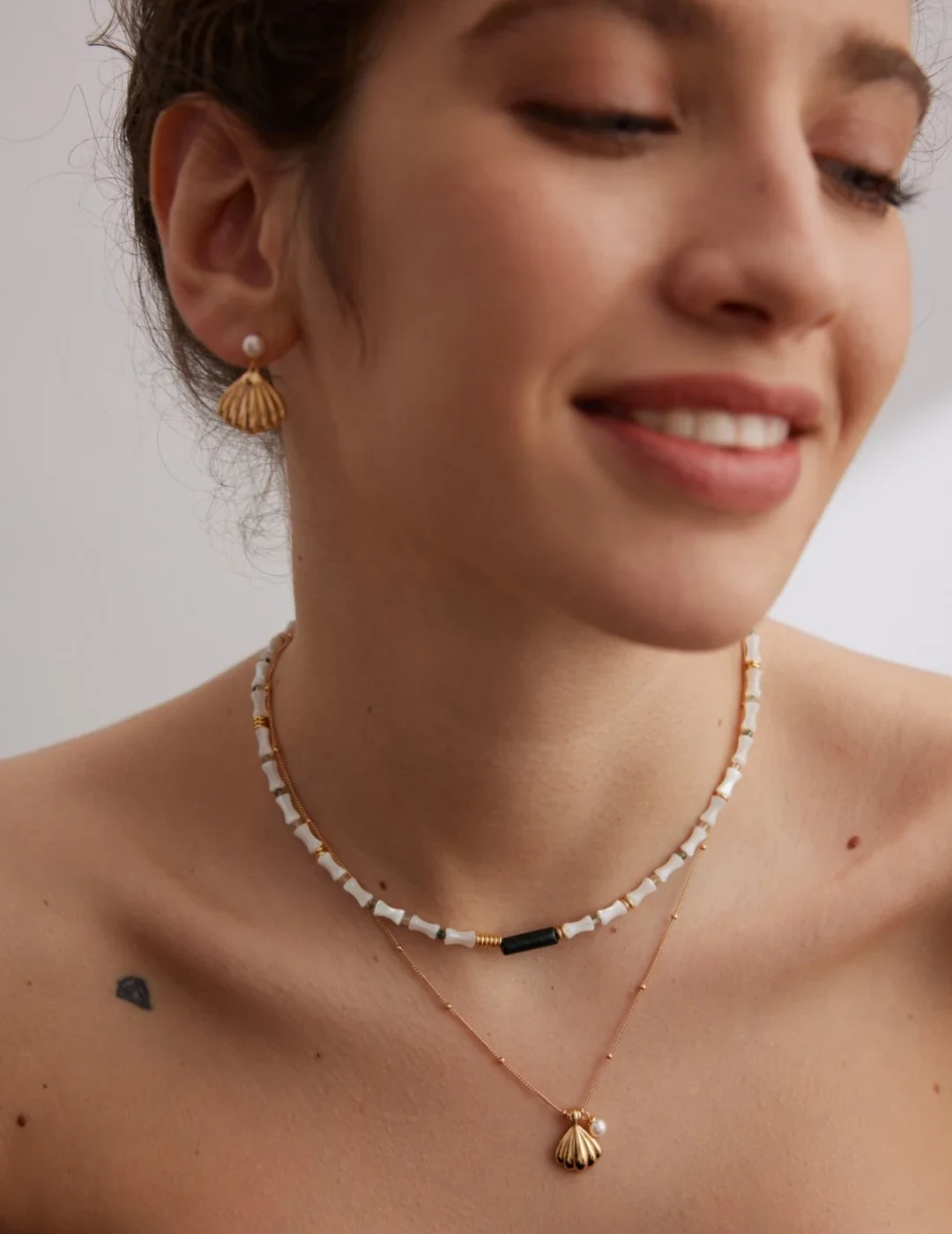 Introducing the Shell We Necklace from our Deja Vu collection. Crafted from high-quality 925 sterling silver and elegantly plated in gold, this delicate piece combines vintage charm with modern simplicity. The necklace features a graceful seashell pendant and a lustrous freshwater pearl, capturing the essence of the ocean’s beauty. Its adjustable chain ensures a perfect fit, making it a versatile accessory for any occasion. Embrace the timeless elegance of the Shell We Necklace and let it be your new favorite go-to piece.