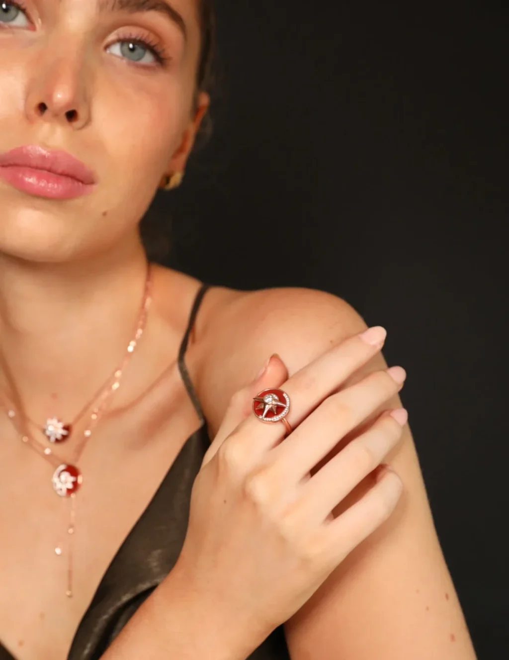 The necklaces are handcrafted from Silver Pro and red agate and micro set with white zirconia stones. All our products are handcrafted and micro set by hand in our ateliers